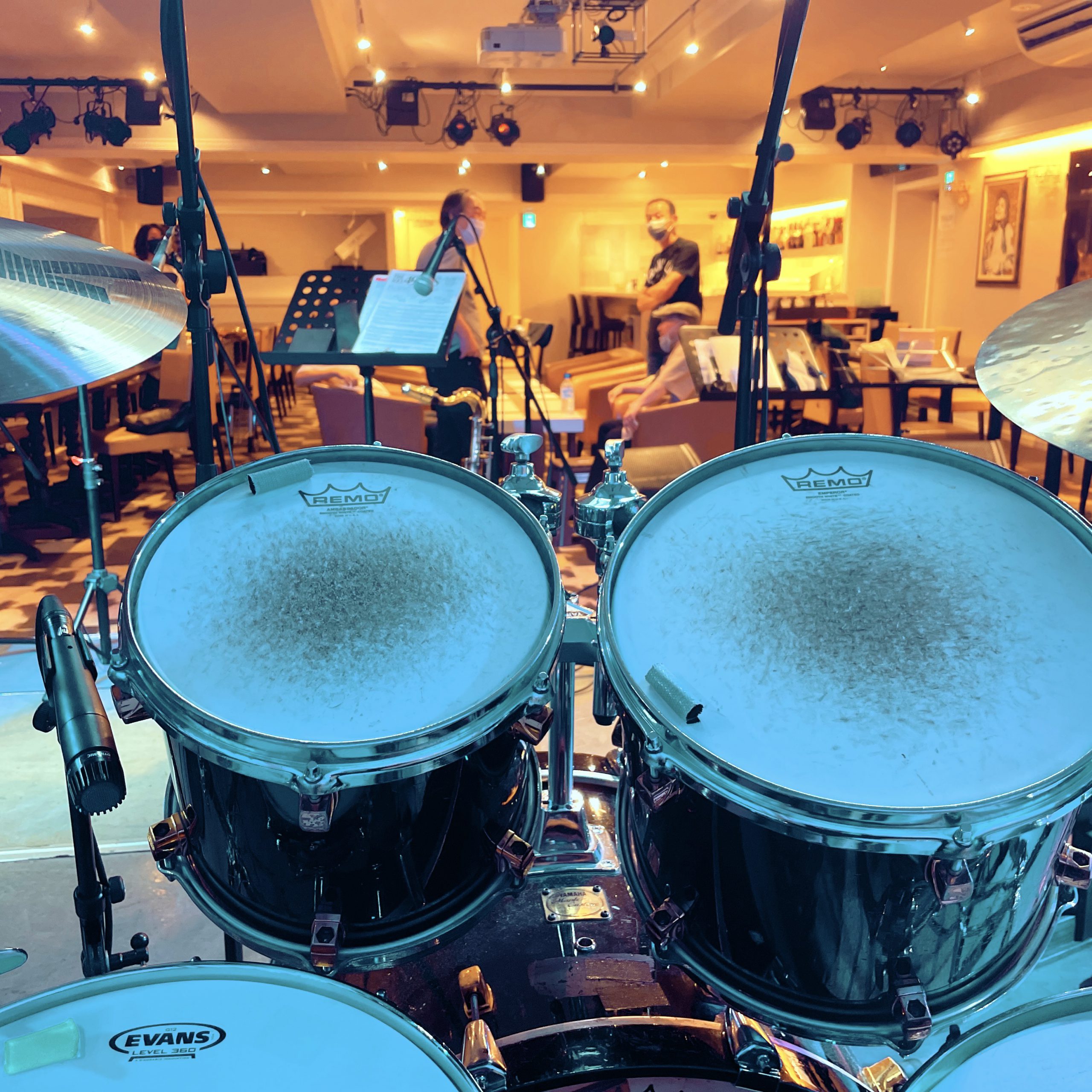 祝日の銀座の午前中。真夏の暑い感じ。人気も車も少なくとも何か現実離れした雰囲気を味わいつつライブ会場へ。前回のリハでも何か自分の演奏がフィットしてなかったり、上手くたちまわれなかったりかで正直今日も心配でしたが、本番当日だしドラマーがビビっててどうする的ないつもの開き直りもあってかベリー・ベリー・楽しく演奏させて頂きました、初めての会場だったけどエンジニアさんがバッチリお仕事して頂いてバンドもやり易かったです。 ハコのドラムキットはヤマハのメイプル・カスタムでした。勝手知ったる楽器なので僕は安心して叩けました。シンバルは何となくの気まぐれでZildjan、K Session Rideをチョイス、スネアはdwの4インチのコレクターズ・メイプル。スネアはまぁ選択ミスではなかったなと思うけど、ヤマハでも良かったかも知れないなー。