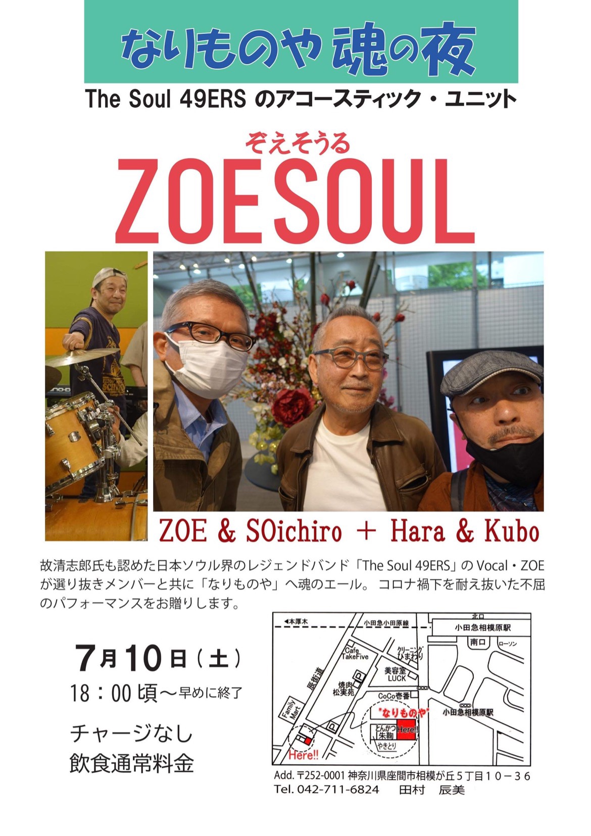 10/23 僕が参加しているTHE SOUL 49ERSのボスZOEさんとソーイチローさんのソウル・ユニット”ZOESOUL”が今年2度目のライブを前回に引き続き小田急相模原駅近くにあります「なりものや」さんで行います。